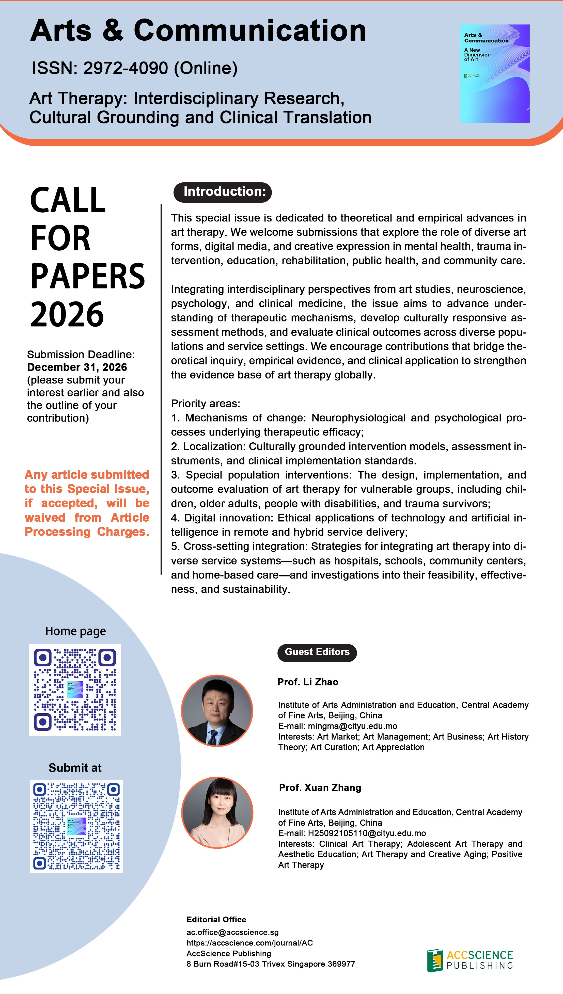Integrating interdisciplinary perspectives from art studies, neuroscience, psychology, and clinical medicine, the issue aims to advance understanding of therapeutic mechanisms, develop culturally responsive assessment methods, and evaluate clinical outcomes across diverse populations and service settings. We encourage contributions that bridge theoretical inquiry, empirical evidence, and clinical application to strengthen the evidence base of art therapy globally.