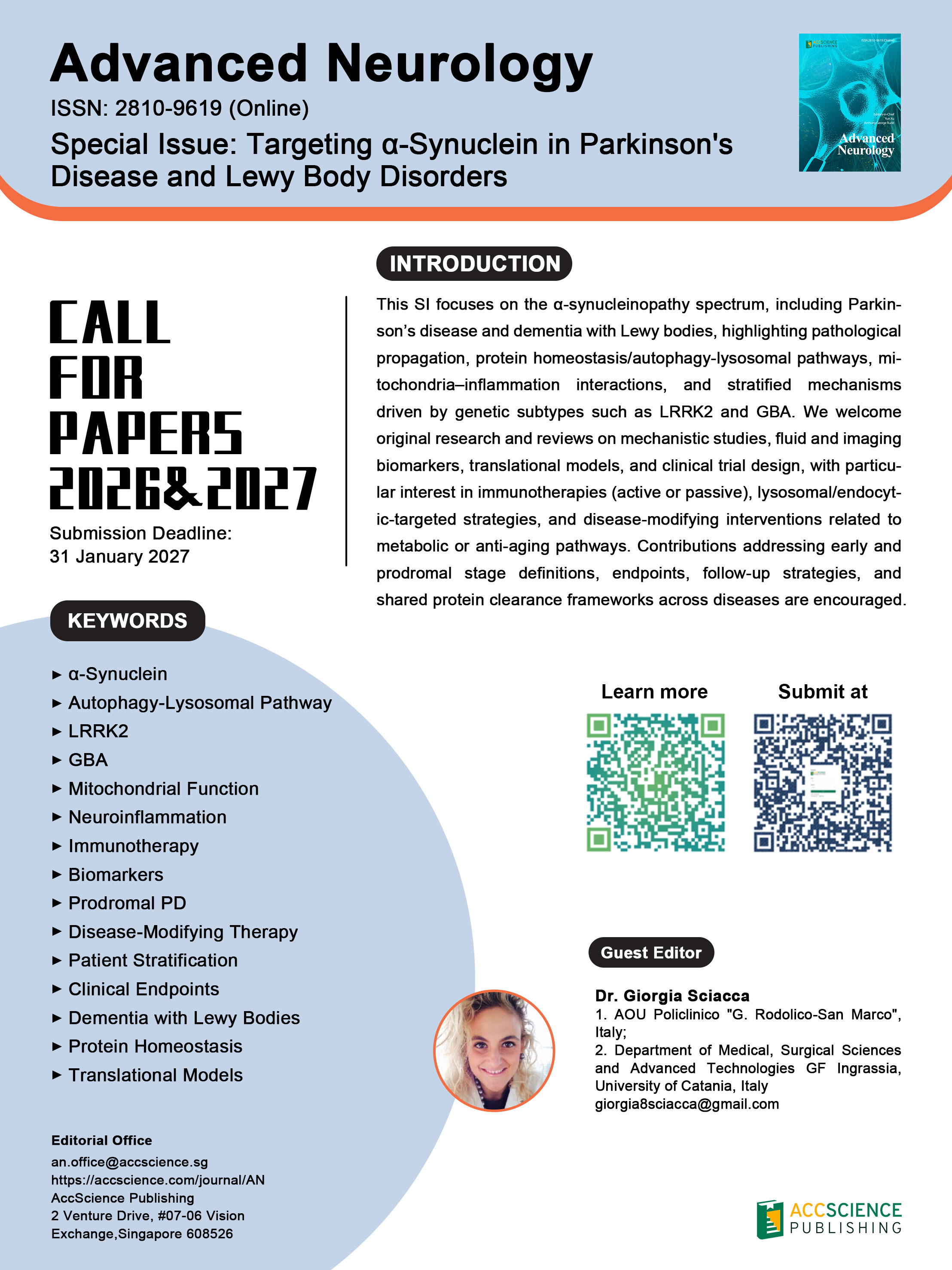 This SI focuses on the α-synucleinopathy spectrum, including Parkinson’s disease and dementia with Lewy bodies, highlighting pathological propagation, protein homeostasis/autophagy-lysosomal pathways, mitochondria–inflammation interactions, and stratified mechanisms driven by genetic subtypes such as LRRK2 and GBA. We welcome original research and reviews on mechanistic studies, fluid and imaging biomarkers, translational models, and clinical trial design, with particular interest in immunotherapies (active or passive), lysosomal/endocytic-targeted strategies, and disease-modifying interventions related to metabolic or anti-aging pathways. Contributions addressing early and prodromal stage definitions, endpoints, follow-up strategies, and shared protein clearance frameworks across diseases are encouraged.