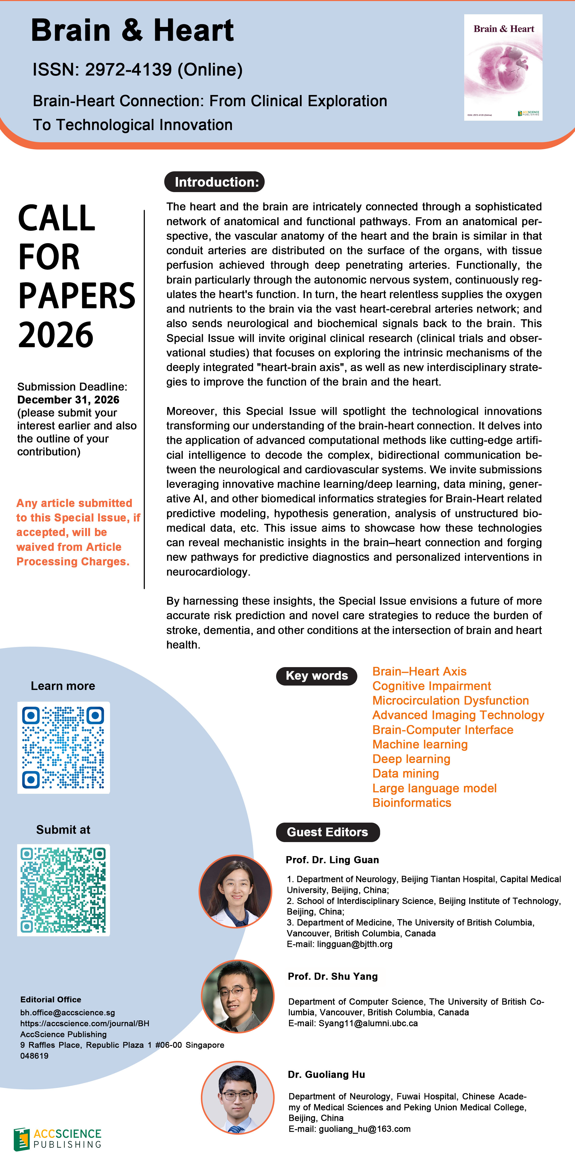 The heart and the brain are intricately connected through a sophisticated network of anatomical and functional pathways. From an anatomical perspective, the vascular anatomy of the heart and the brain is similar in that conduit arteries are distributed on the surface of the organs, with tissue perfusion achieved through deep penetrating arteries. Functionally, the brain particularly through the autonomic nervous system, continuously regulates the heart's function. In turn, the heart relentless supplies the oxygen and nutrients to the brain via the vast heart-cerebral arteries network; and also sends neurological and biochemical signals back to the brain. This Special Issue will invite original clinical research (clinical trials and observational studies) that focuses on exploring the intrinsic mechanisms of the deeply integrated "heart-brain axis", as well as new interdisciplinary strategies to improve the function of the brain and the heart.