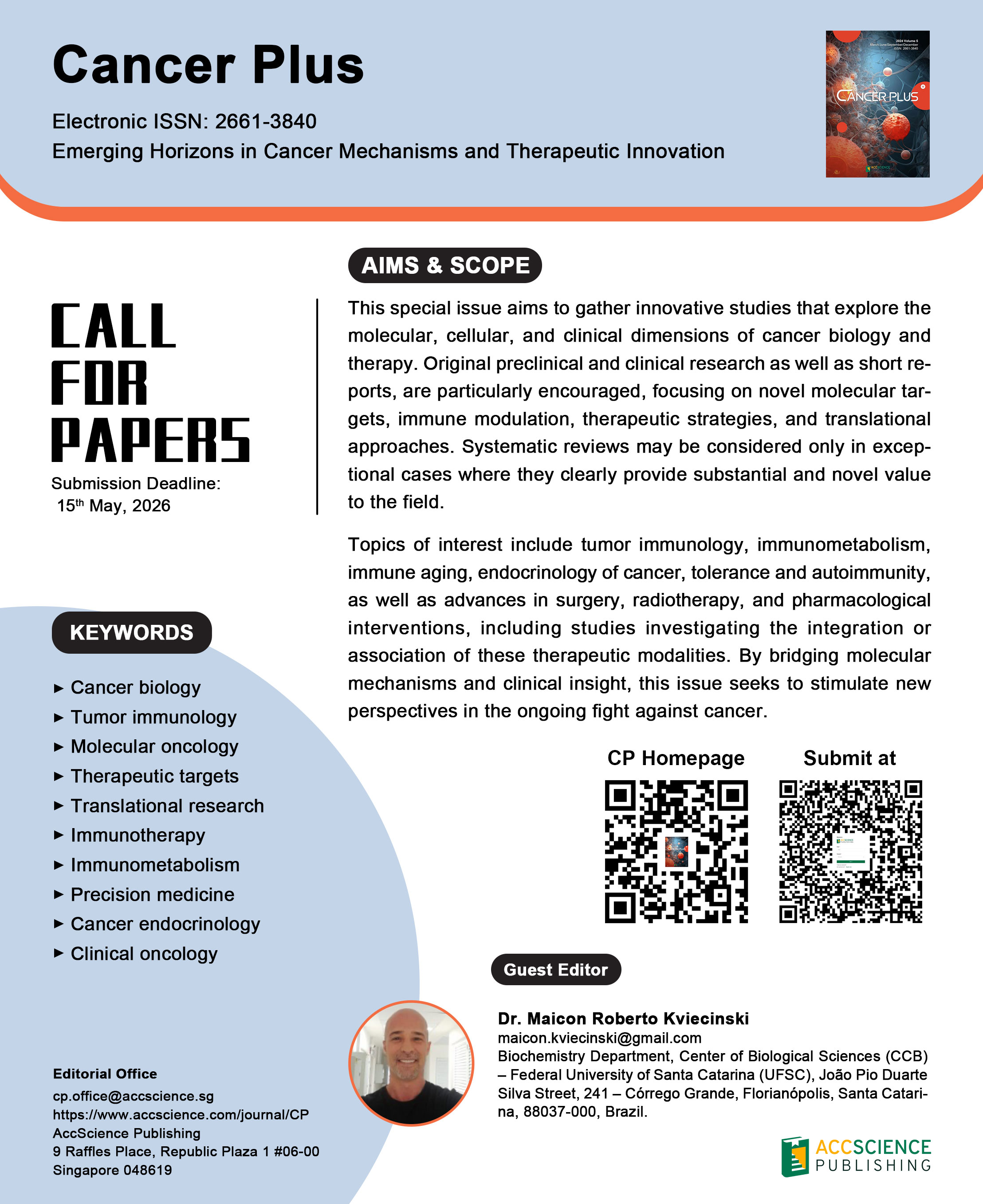 Biochemistry Department, Center of Biological Sciences (CCB) – Federal University of Santa Catarina (UFSC), João Pio Duarte Silva Street, 241 – Córrego Grande, Florianópolis, Santa Catarina, 88037-000, Brazil.Cancer biology; Tumor immunology; Molecular oncology; Therapeutic targets; Translational research; Immunotherapy; Immunometabolism; Precision medicine; Cancer endocrinology; Clinical oncology