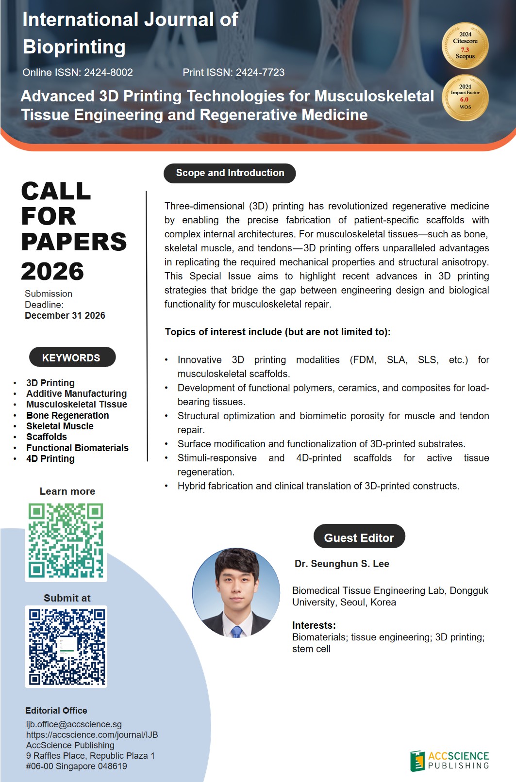 Three-dimensional (3D) printing has revolutionized regenerative medicine by enabling the precise fabrication of patient-specific scaffolds with complex internal architectures. For musculoskeletal tissues—such as bone, skeletal muscle, and tendons—3D printing offers unparalleled advantages in replicating the required mechanical properties and structural anisotropy. This Special Issue aims to highlight recent advances in 3D printing strategies that bridge the gap between engineering design and biological functionality for musculoskeletal repair.