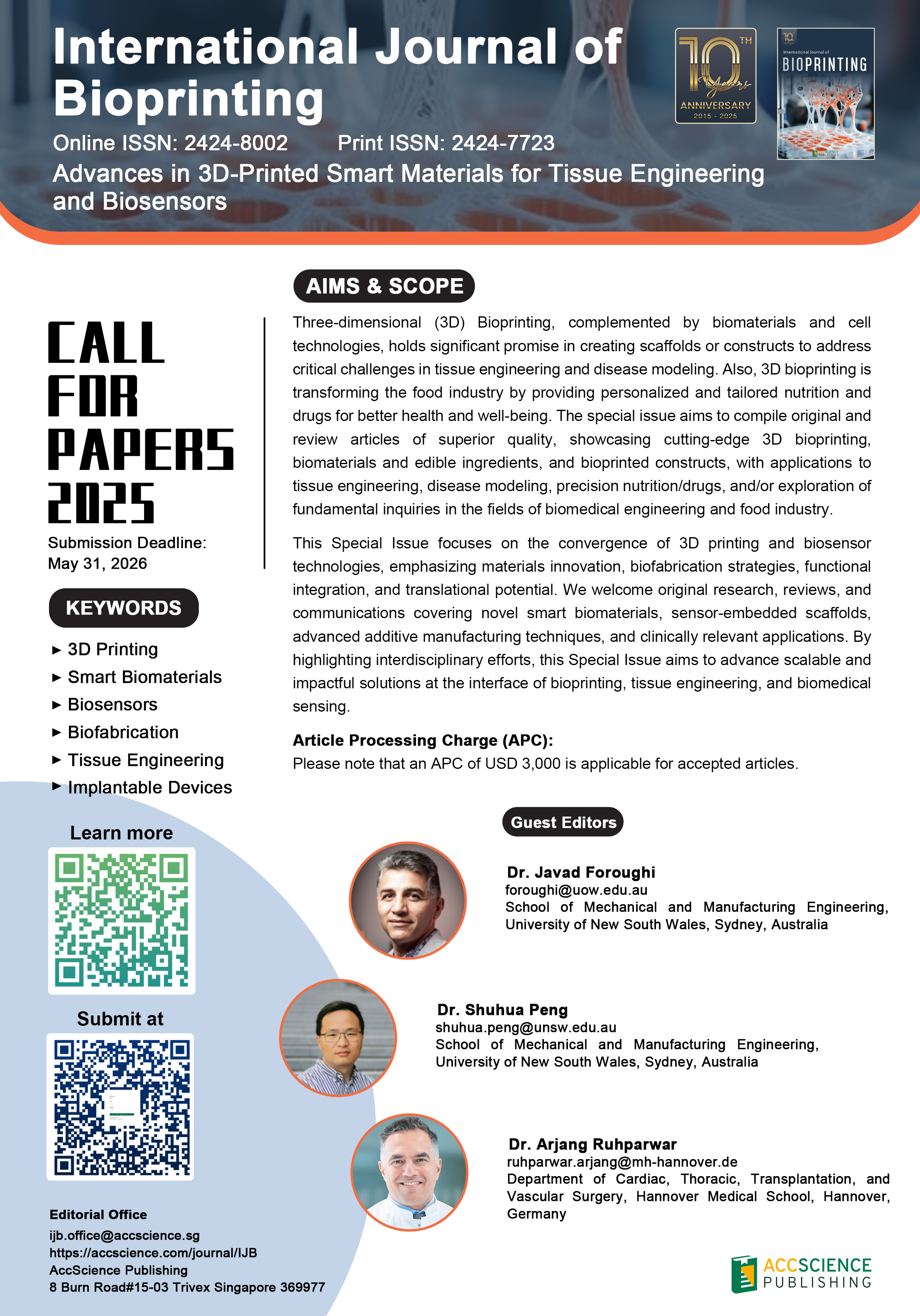 This Special Issue focuses on the convergence of 3D printing and biosensor technologies, emphasizing materials innovation, biofabrication strategies, functional integration, and translational potential. We welcome original research, reviews, and communications covering novel smart biomaterials, sensor-embedded scaffolds, advanced additive manufacturing techniques, and clinically relevant applications. By highlighting interdisciplinary efforts, this Special Issue aims to advance scalable and impactful solutions at the interface of bioprinting, tissue engineering, and biomedical sensing.