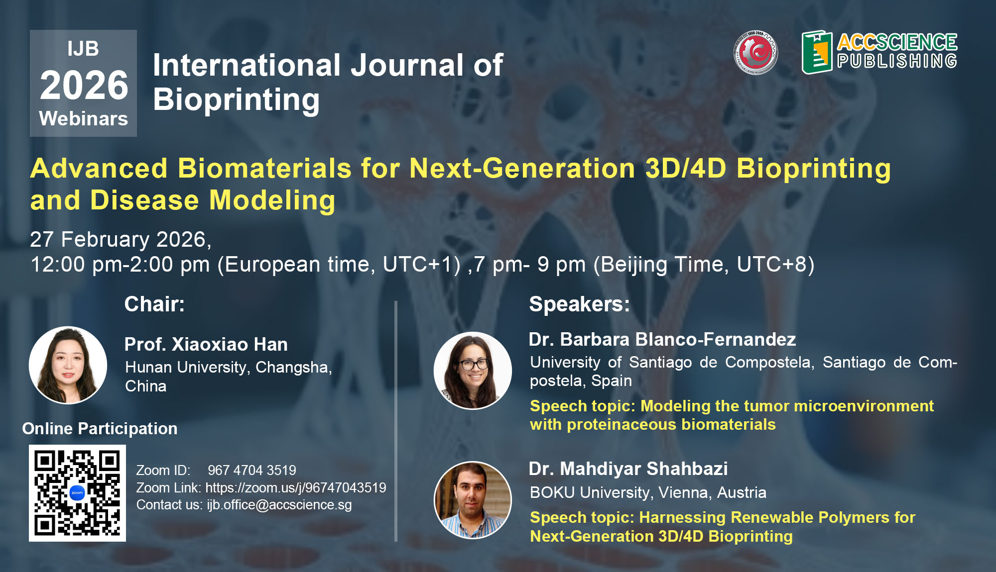 We warmly invite researchers, clinicians, and students interested in biofabrication, biomaterials, tissue engineering, and disease modeling to join us for this engaging and forward-looking discussion.