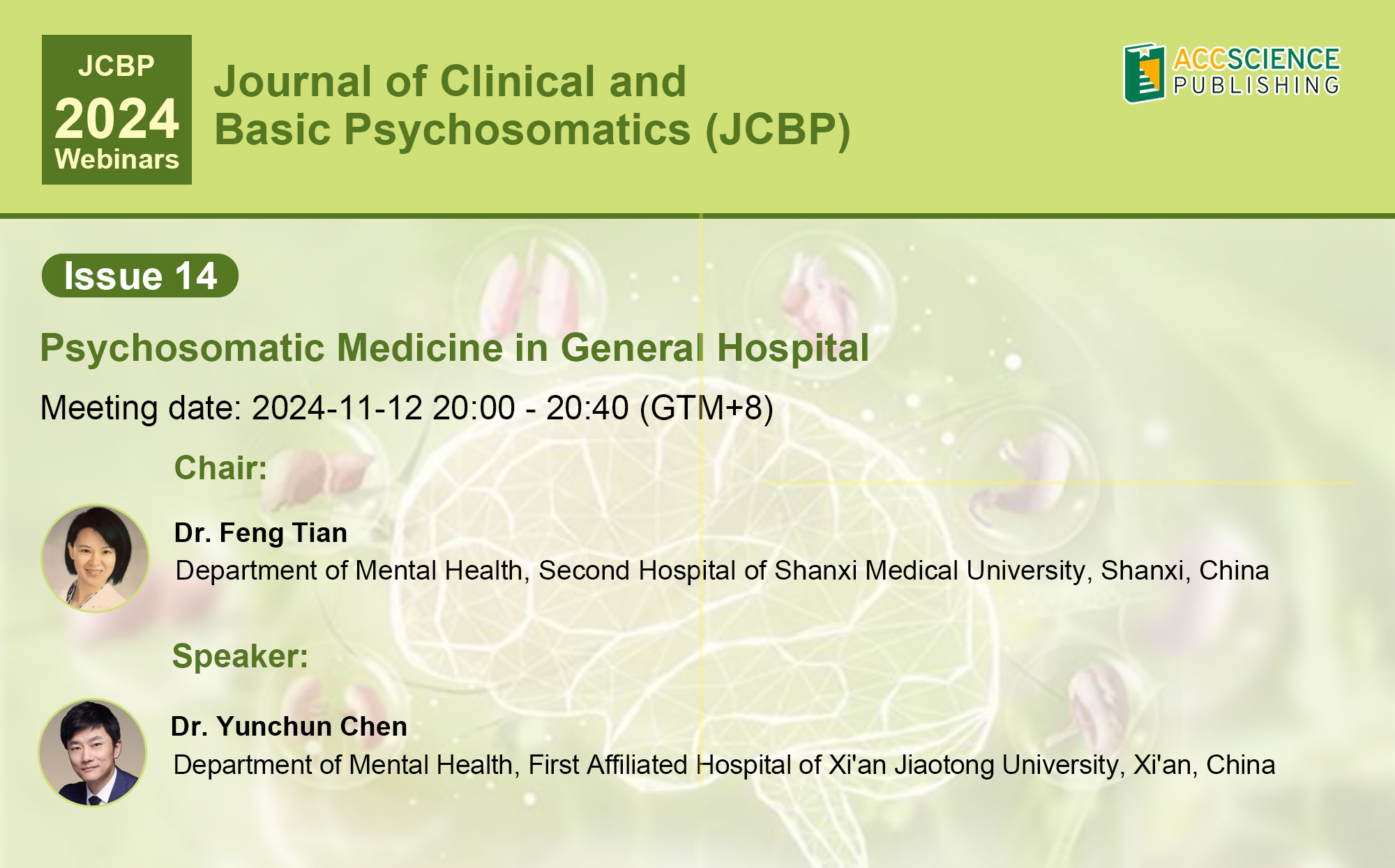 The Journal of Clinical and Basic Psychosomatics will hold this live lecture titled "Psychosomatic Medicine in General Hospital" on Bilibili and WeChat Channels at 20:00 on November 12, 2024 (GMT+08:00).