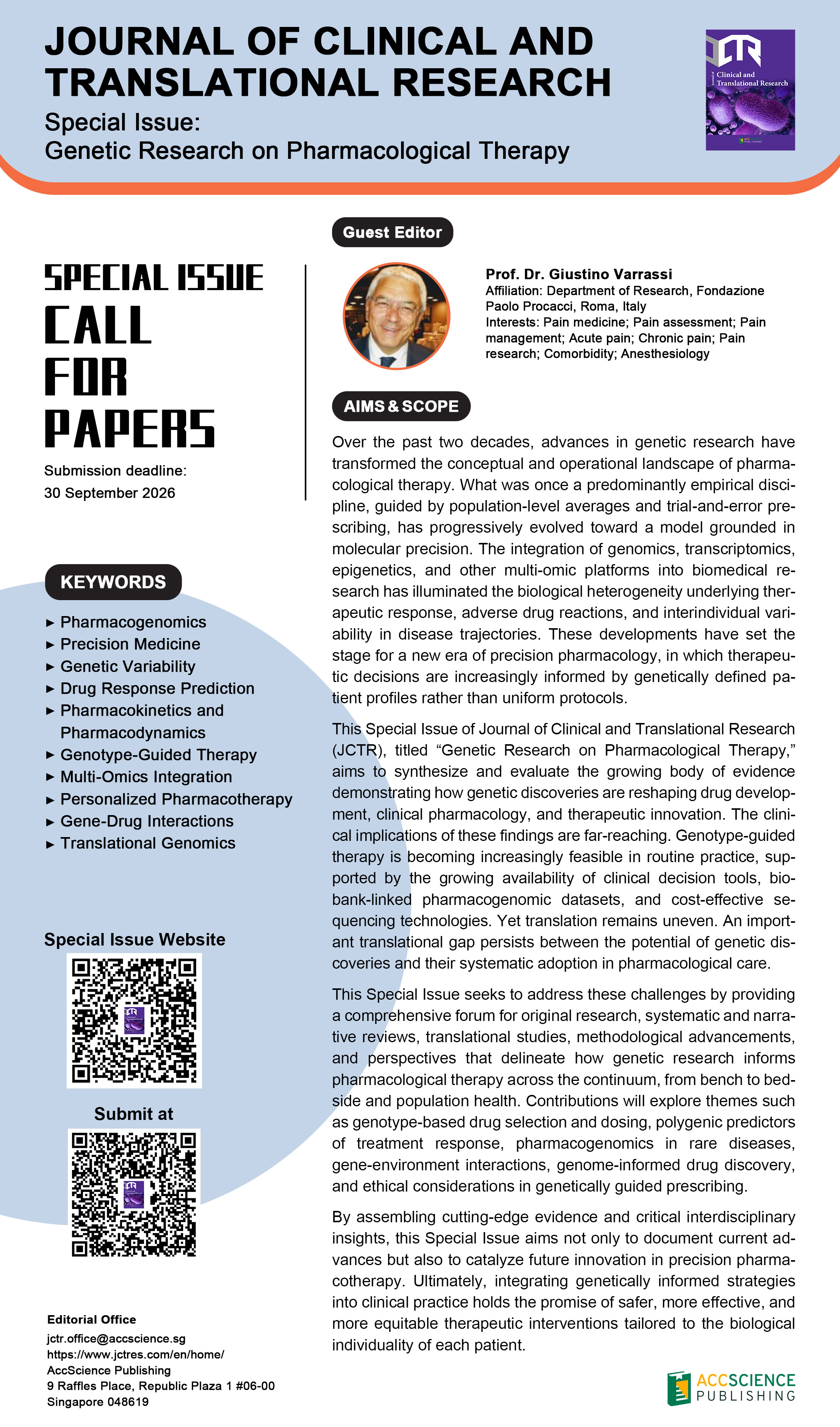 This Special Issue of the Journal of Clinical and Translational Research (JCTR), titled “Genetic Research on Pharmacological Therapy”, aims to synthesize and evaluate the growing body of evidence demonstrating how genetic discoveries are reshaping drug development, clinical pharmacology, and therapeutic innovation. Rapidly expanding genetic datasets, generated through next-generation sequencing, genome-wide association studies (GWAS), and single-cell multi-omics, have provided mechanistic insights into drug metabolism, transport, and target engagement. For instance, polymorphisms in cytochrome P450 isoenzymes, such as CYP2D6, CYP2C19, and CYP3A5, have revealed reproducible associations with variable efficacy and toxicity across several drug classes, profoundly influencing prescribing algorithms in psychiatry, oncology, cardiology, and pain medicine. Beyond pharmacokinetics, genetic research has also deepened our understanding of pharmacodynamics, facilitating the identification of genetically defined responders and non-responders to targeted therapies, monoclonal antibodies, and biologics.