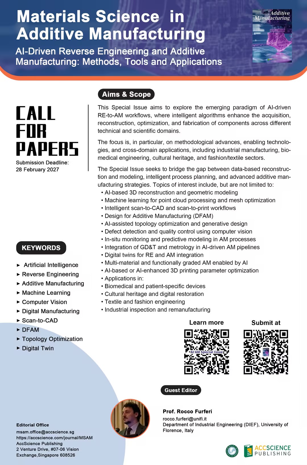 The Special Issue seeks to bridge the gap between data-based reconstruction and modeling, intelligent process planning, and advanced additive manufacturing strategies. Topics of interest include, but are not limited to: