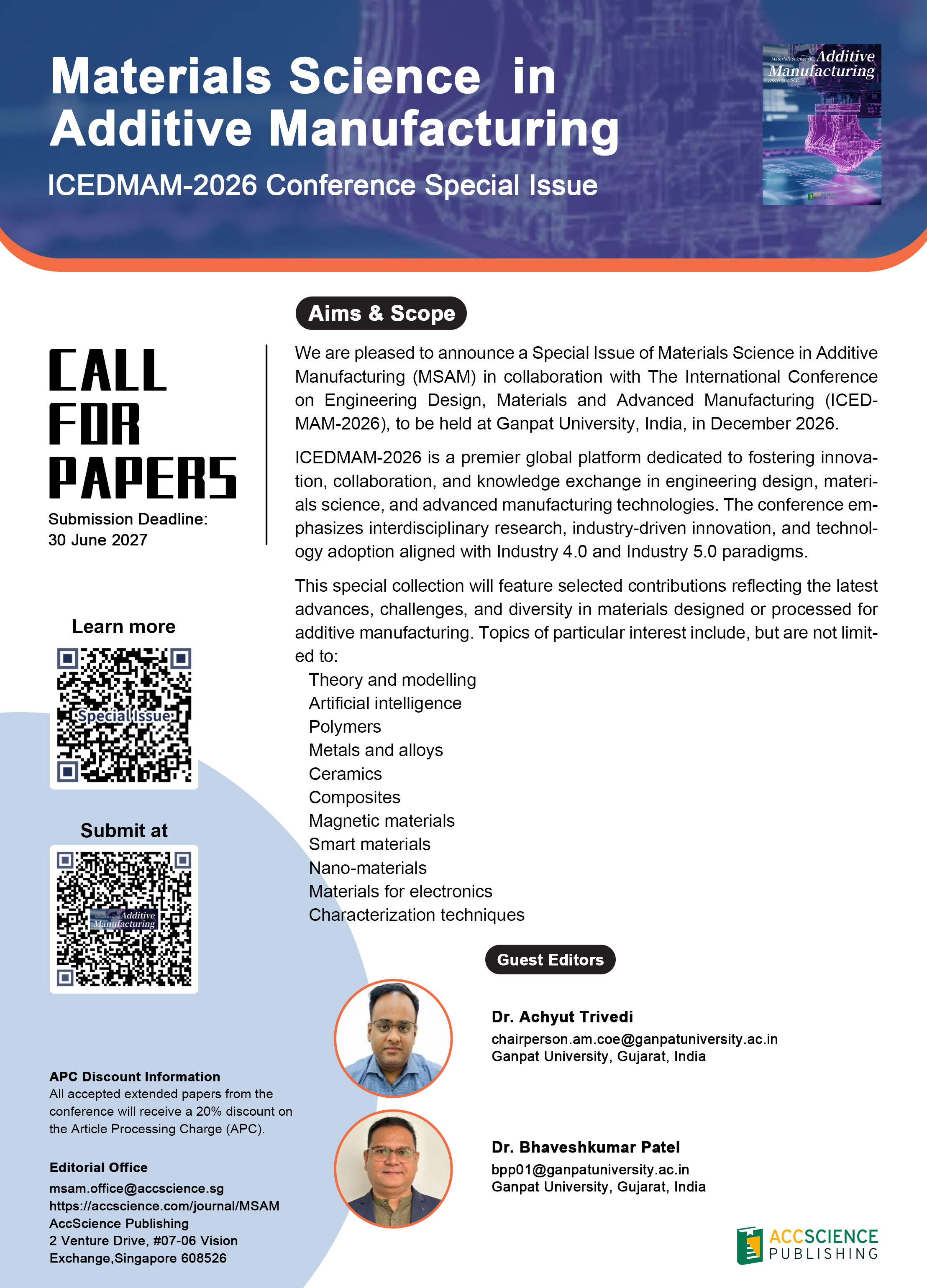 We are pleased to announce a Special Issue of Materials Science in Additive Manufacturing (MSAM) in collaboration with The International Conference on Engineering Design, Materials and Advanced Manufacturing (ICEDMAM-2026), to be held at Ganpat University, India, in December 2026.
