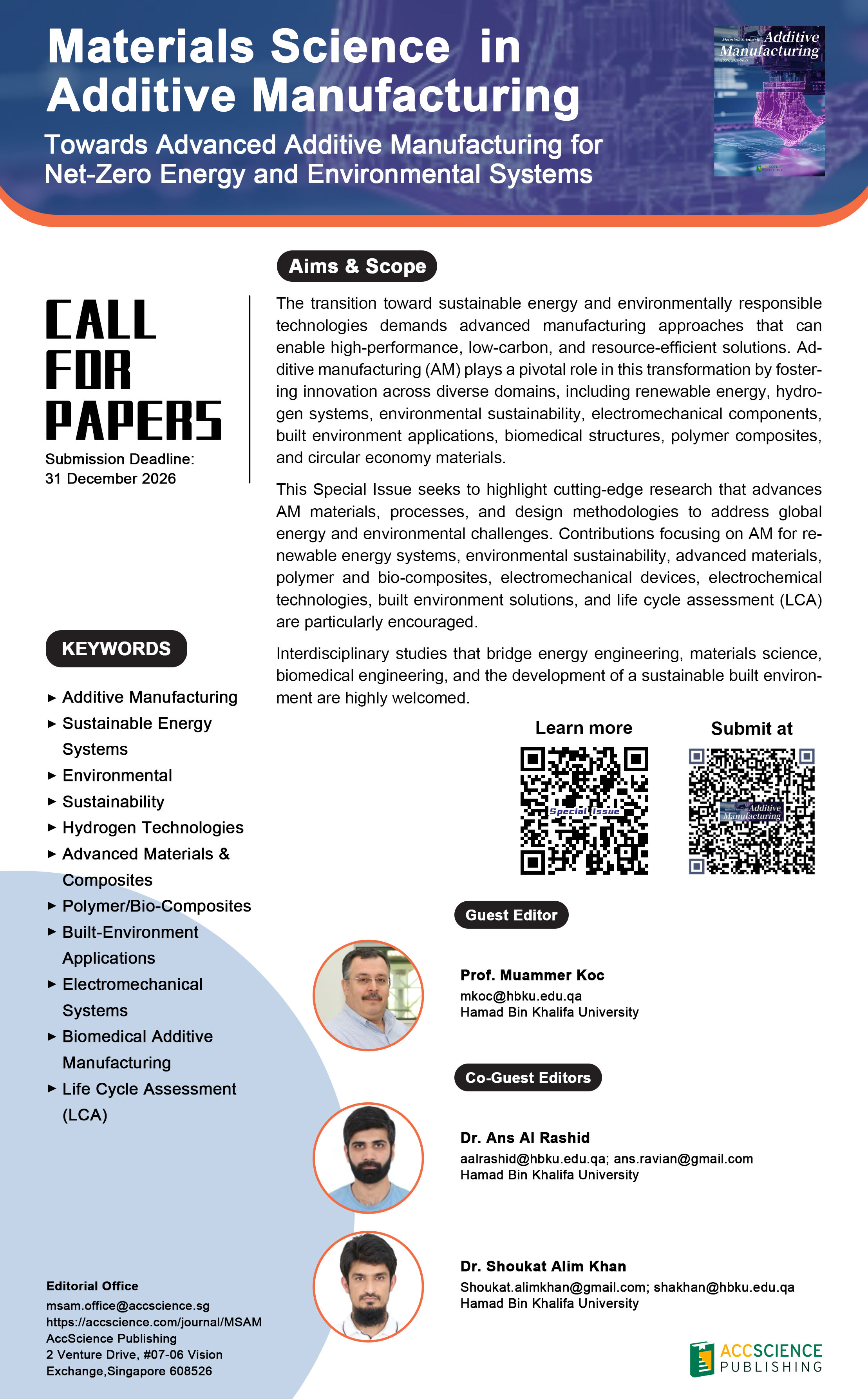 This Special Issue seeks to highlight cutting-edge research that advances AM materials, processes, and design methodologies to address global energy and environmental challenges. Contributions focusing on AM for renewable energy systems, environmental sustainability, advanced materials, polymer and bio-composites, electromechanical devices, electrochemical technologies, built environment solutions, and life cycle assessment (LCA) are particularly encouraged.