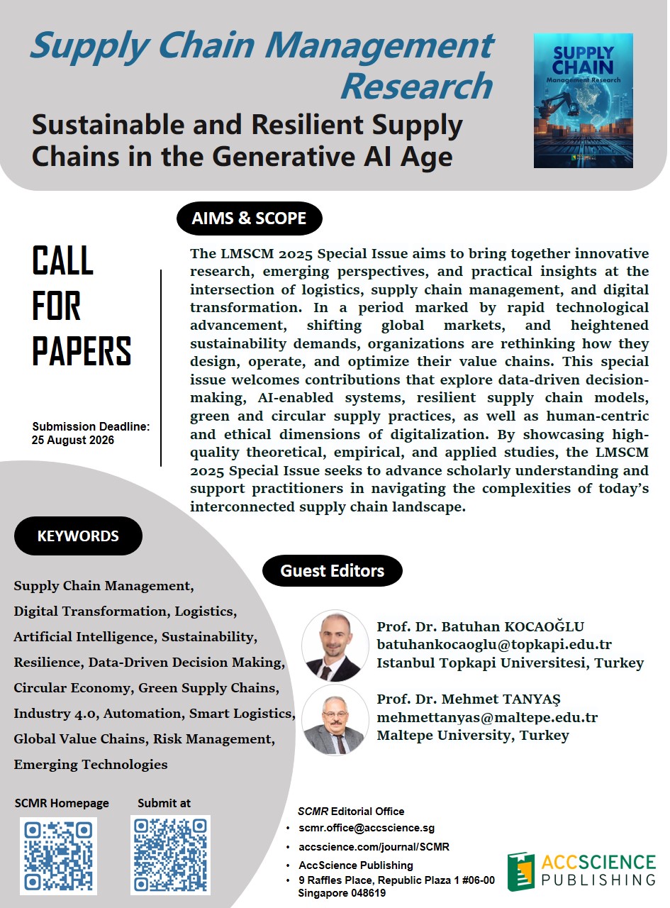 The LMSCM 2025 Special Issue aims to bring together innovative research, emerging perspectives, and practical insights at the intersection of logistics, supply chain management, and digital transformation. In a period marked by rapid technological advancement, shifting global markets, and heightened sustainability demands, organizations are rethinking how they design, operate, and optimize their value chains. This special issue welcomes contributions that explore data-driven decision-making, AI-enabled systems, resilient supply chain models, green and circular supply practices, as well as human-centric and ethical dimensions of digitalization. By showcasing high-quality theoretical, empirical, and applied studies, the LMSCM 2025 Special Issue seeks to advance scholarly understanding and support practitioners in navigating the complexities of today’s interconnected supply chain landscape.
