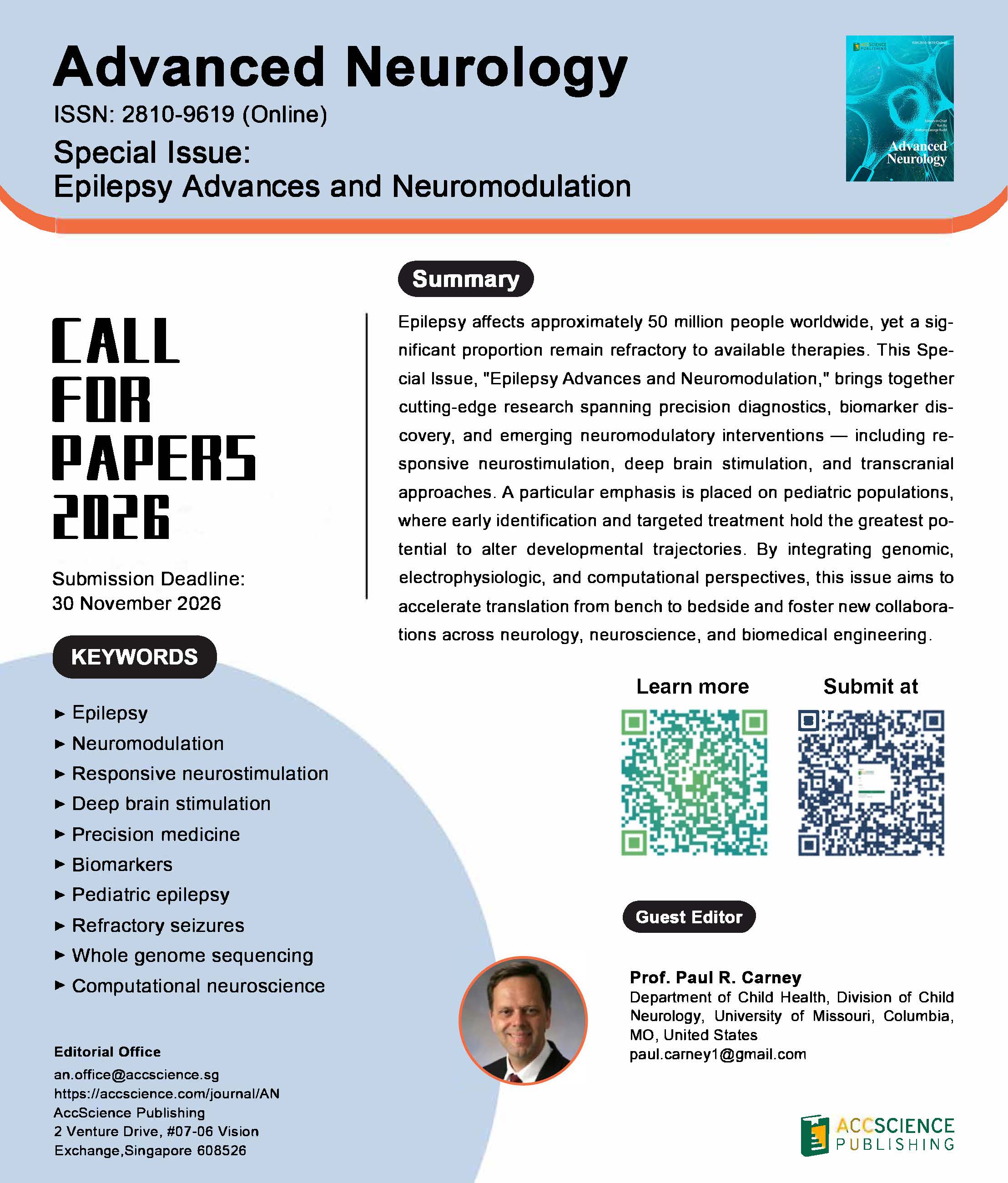Epilepsy affects approximately 50 million people worldwide, yet a significant proportion remain refractory to available therapies. This Special Issue, "Epilepsy Advances and Neuromodulation," brings together cutting-edge research spanning precision diagnostics, biomarker discovery, and emerging neuromodulatory interventions — including responsive neurostimulation, deep brain stimulation, and transcranial approaches. A particular emphasis is placed on pediatric populations, where early identification and targeted treatment hold the greatest potential to alter developmental trajectories. By integrating genomic, electrophysiologic, and computational perspectives, this issue aims to accelerate translation from bench to bedside and foster new collaborations across neurology, neuroscience, and biomedical engineering.