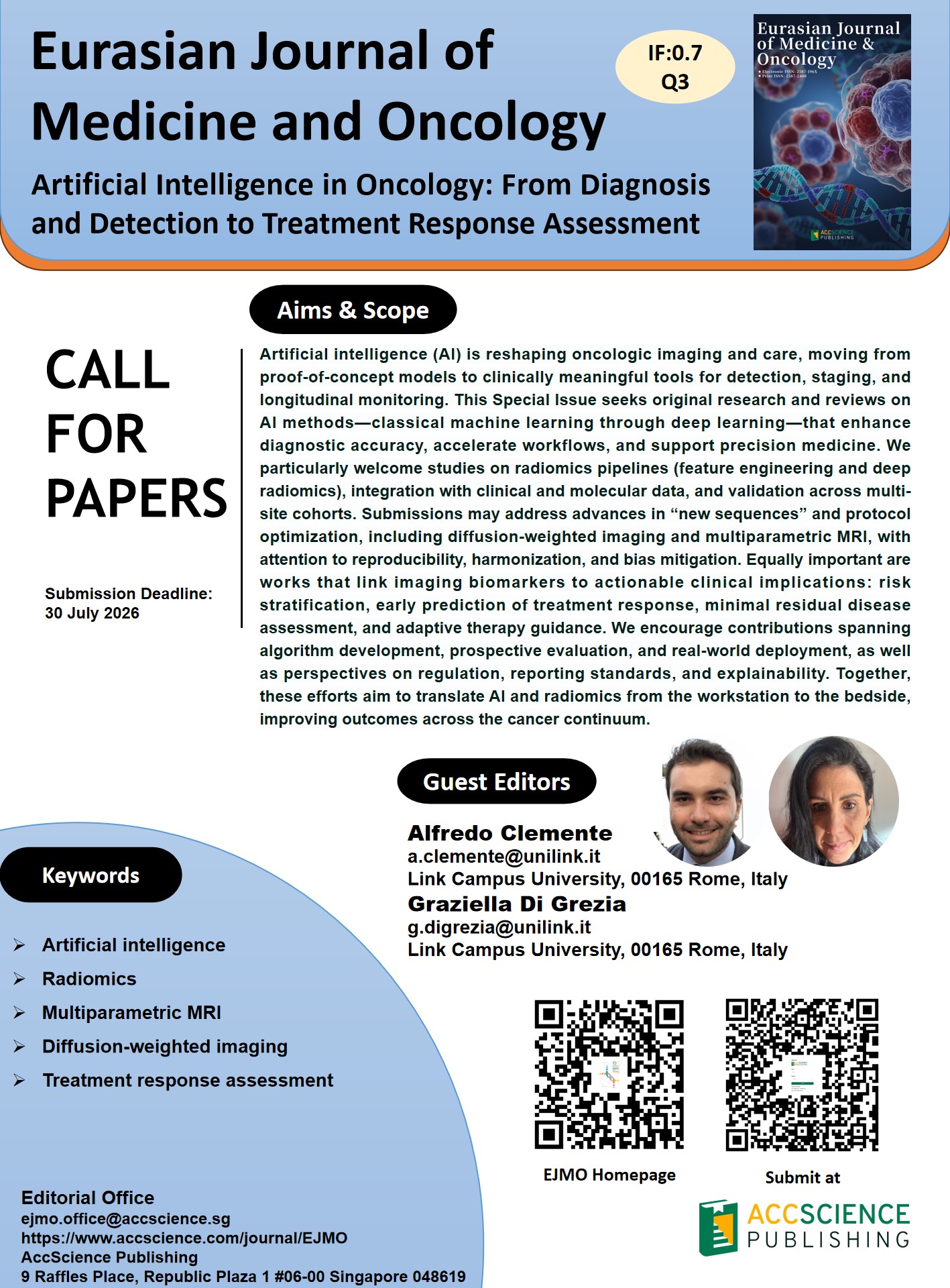 Artificial intelligence (AI) is reshaping oncologic imaging and care, moving from proof-of-concept models to clinically meaningful tools for detection, staging, and longitudinal monitoring. This Special Issue seeks original research and reviews on AI methods—classical machine learning through deep learning—that enhance diagnostic accuracy, accelerate workflows, and support precision medicine. We particularly welcome studies on radiomics pipelines (feature engineering and deep radiomics), integration with clinical and molecular data, and validation across multi-site cohorts. Submissions may address advances in “new sequences” and protocol optimization, including diffusion-weighted imaging and multiparametric MRI, with attention to reproducibility, harmonization, and bias mitigation. Equally important are works that link imaging biomarkers to actionable clinical implications: risk stratification, early prediction of treatment response, minimal residual disease assessment, and adaptive therapy guidance. We encourage contributions spanning algorithm development, prospective evaluation, and real-world deployment, as well as perspectives on regulation, reporting standards, and explainability. Together, these efforts aim to translate AI and radiomics from the workstation to the bedside, improving outcomes across the cancer continuum.