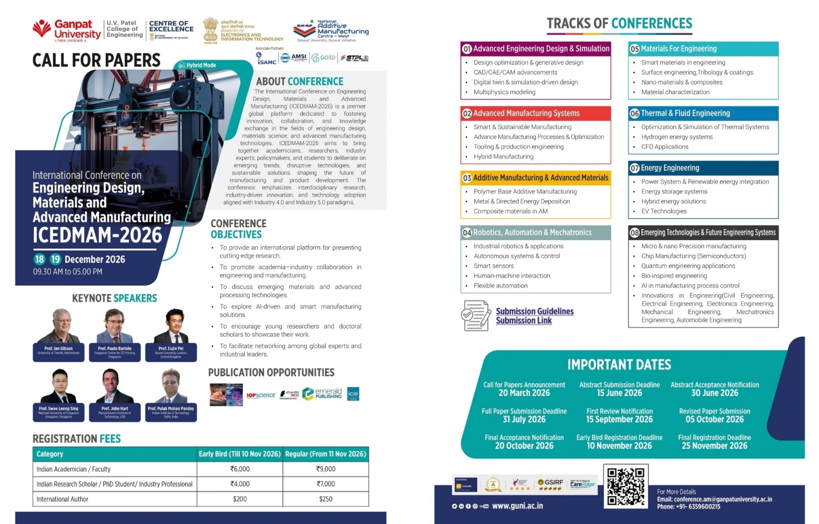 The International Conference on Engineering Design, Materials and Advanced Manufacturing (ICEDMAM-2026) is a premier global platform dedicated to fostering innovation, collaboration, and knowledge exchange in the fields of engineering design, materials science, and advanced manufacturing technologies. ICEDMAM-2026 aims to bring together academicians, researchers, industry experts, policymakers, and students to deliberate on emerging trends, disruptive technologies, and sustainable solutions shaping the future of manufacturing and product development. The conference emphasizes interdisciplinary research, industry-driven innovation, and technology adoption aligned with Industry 4.0 and Industry 5.0 paradigms.