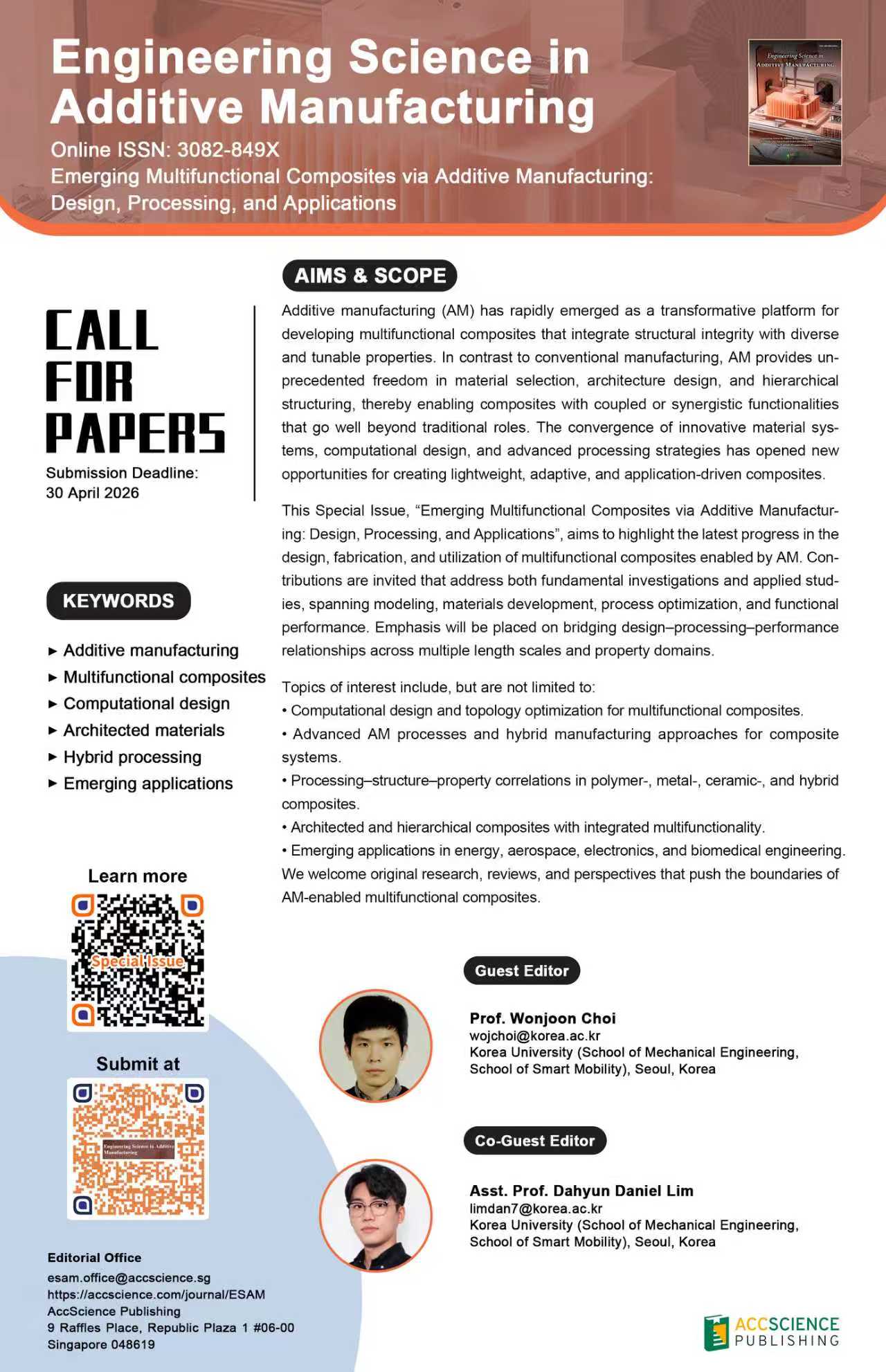 We welcome original research, reviews, and perspectives that push the boundaries of AM-enabled multifunctional composites.