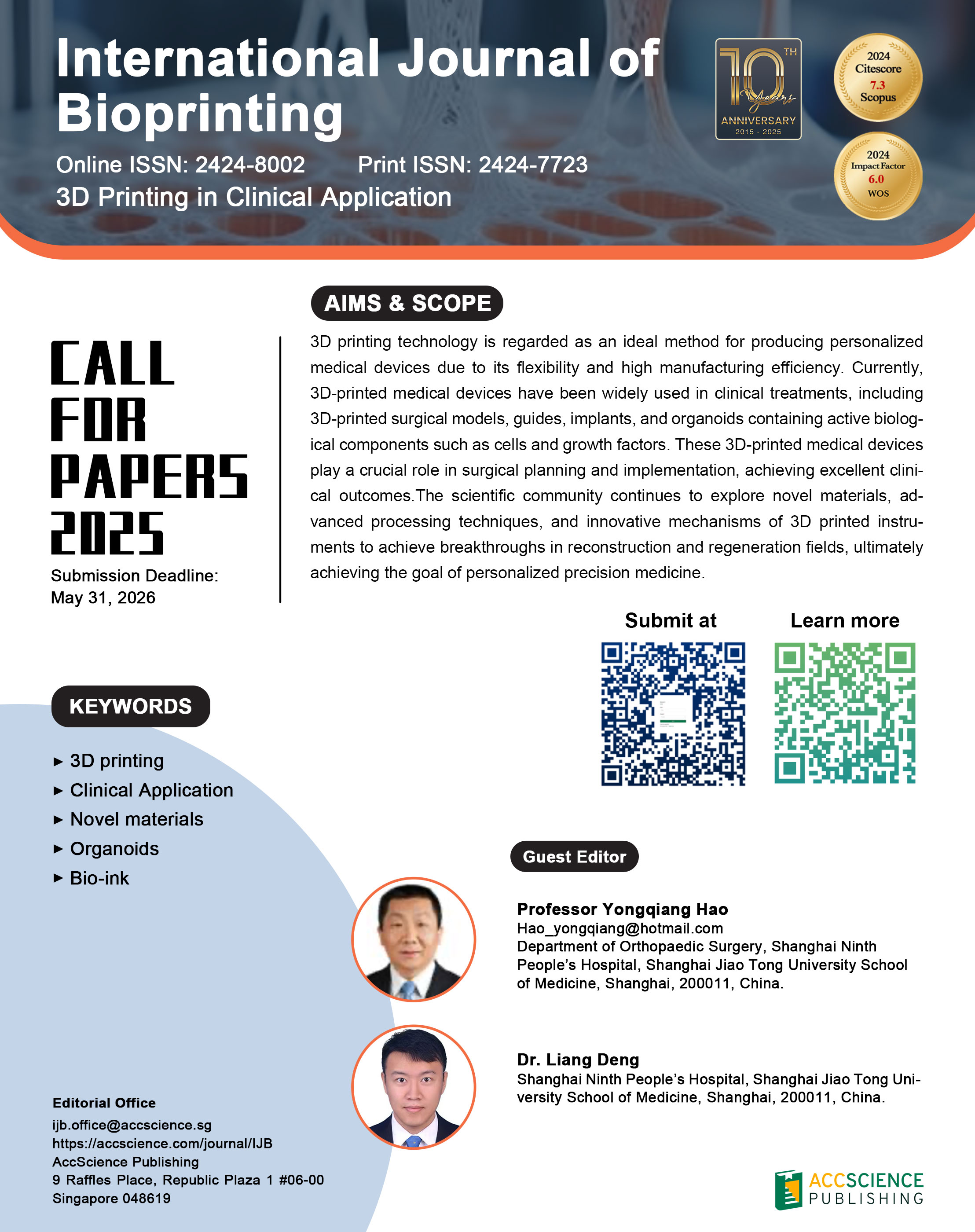 3D printing technology is regarded as an ideal method for producing personalized medical devices due to its flexibility and high manufacturing efficiency. Currently, 3D-printed medical devices have been widely used in clinical treatments, including 3D-printed surgical models, guides, implants, and organoids containing active biological components such as cells and growth factors. These 3D-printed medical devices play a crucial role in surgical planning and implementation, achieving excellent clinical outcomes.The scientific community continues to explore novel materials, advanced processing techniques, and innovative mechanisms of 3D printed instruments to achieve breakthroughs in reconstruction and regeneration fields, ultimately achieving the goal of personalized precision medicine.