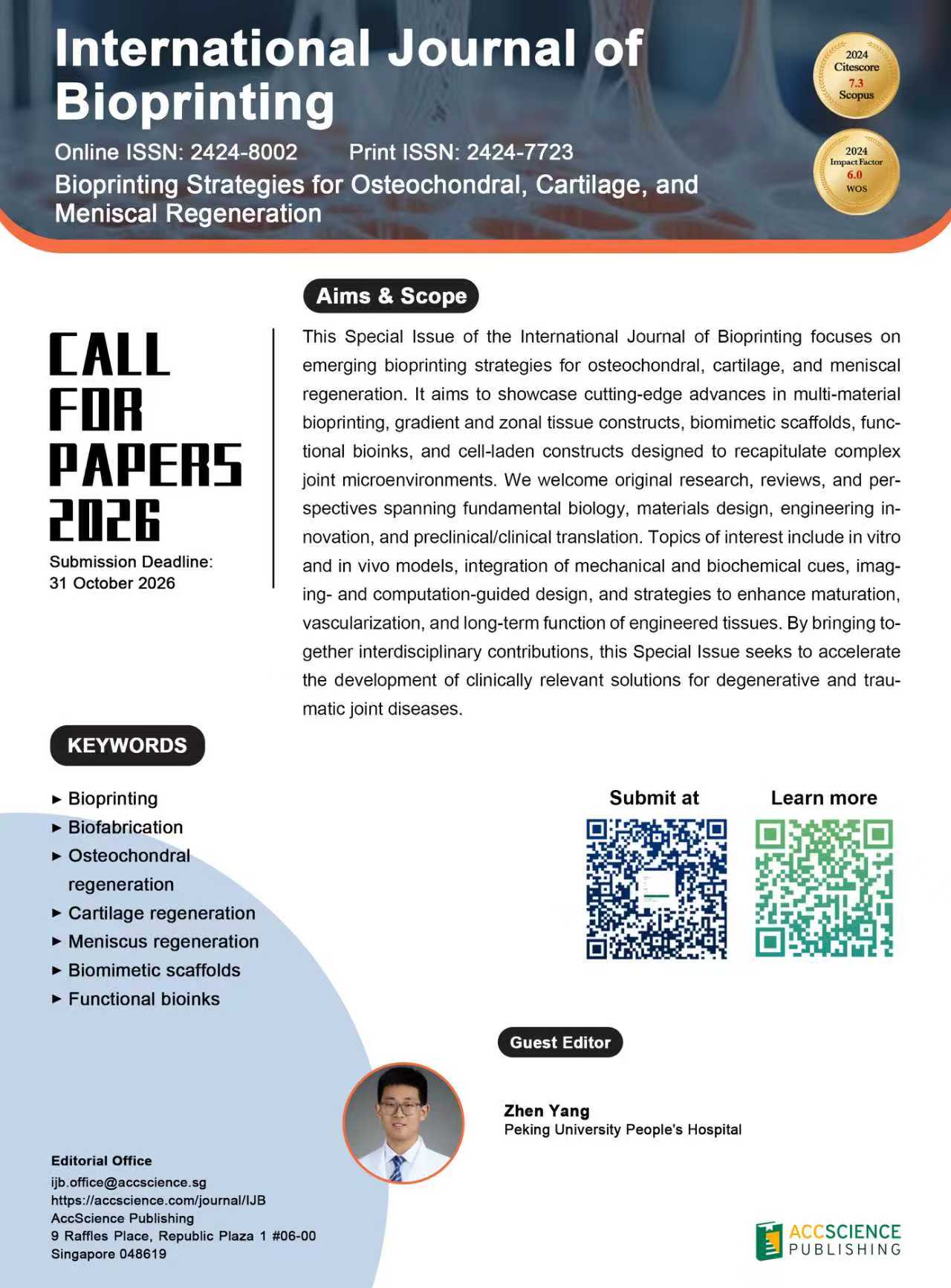 This Special Issue of the International Journal of Bioprinting focuses on emerging bioprinting strategies for osteochondral, cartilage, and meniscal regeneration. It aims to showcase cutting-edge advances in multi-material bioprinting, gradient and zonal tissue constructs, biomimetic scaffolds, functional bioinks, and cell-laden constructs designed to recapitulate complex joint microenvironments. We welcome original research, reviews, and perspectives spanning fundamental biology, materials design, engineering innovation, and preclinical/clinical translation. Topics of interest include in vitro and in vivo models, integration of mechanical and biochemical cues, imaging- and computation-guided design, and strategies to enhance maturation, vascularization, and long-term function of engineered tissues. By bringing together interdisciplinary contributions, this Special Issue seeks to accelerate the development of clinically relevant solutions for degenerative and traumatic joint diseases.