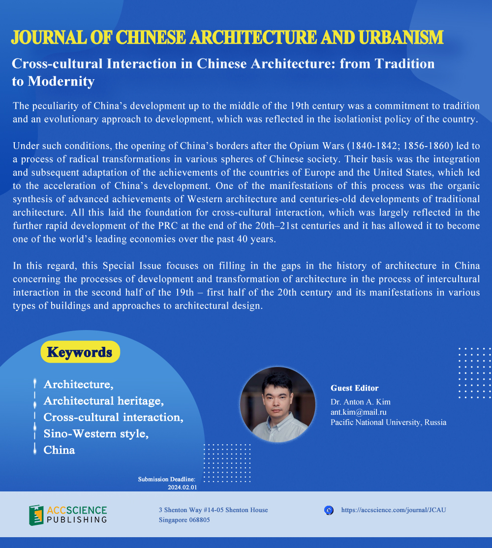 In this regard, this Special Issue focuses on filling in the gaps in the history of architecture in China concerning the processes of development and transformation of architecture in the process of intercultural interaction in the second half of the 19th – first half of the 20th century and its manifestations in various types of buildings and approaches to architectural design.